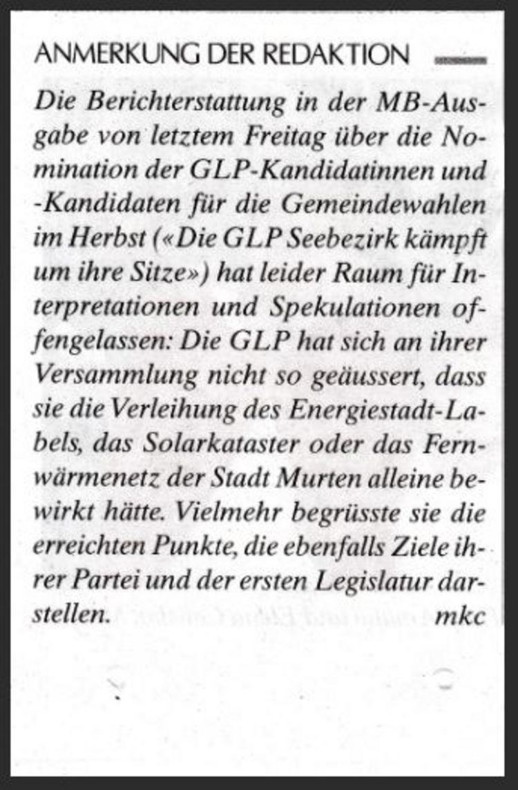 In der Berichterstattung des MB vom 4.9. wurden sehr viele energiepolitische Entwicklungen sowie auch firmeninterne Entscheide der IB-Murten als Verdienste der glp ausgewiesen. Nach der Reaktion der FDP und einem Leserbrief dazu erschien folgende Anmerkung: